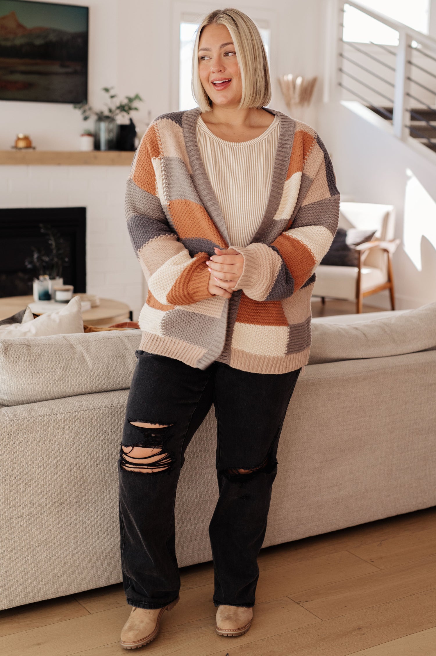 Wrap yourself up in cozy style with this Brown Sugar and Molasses Checkered Cardigan! It's made with a mid-weight sweater knit, featuring a dropped shoulder and an open front. The multi-colored checkered pattern adds a fun, playful touch, perfect for keeping you warm on chilly days.