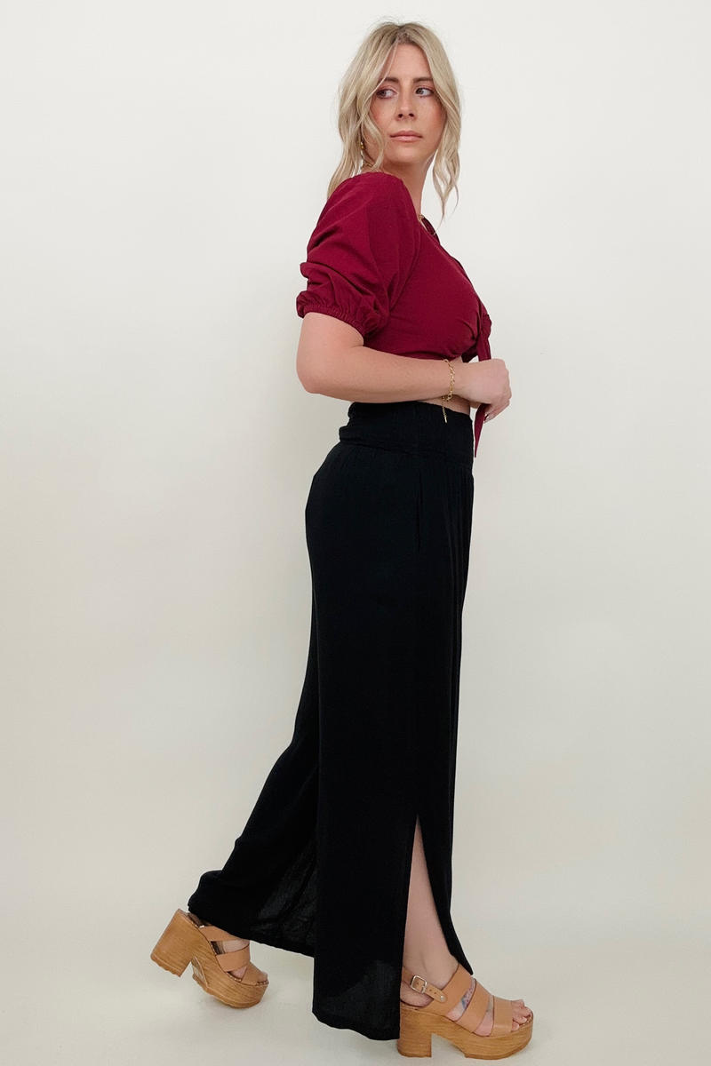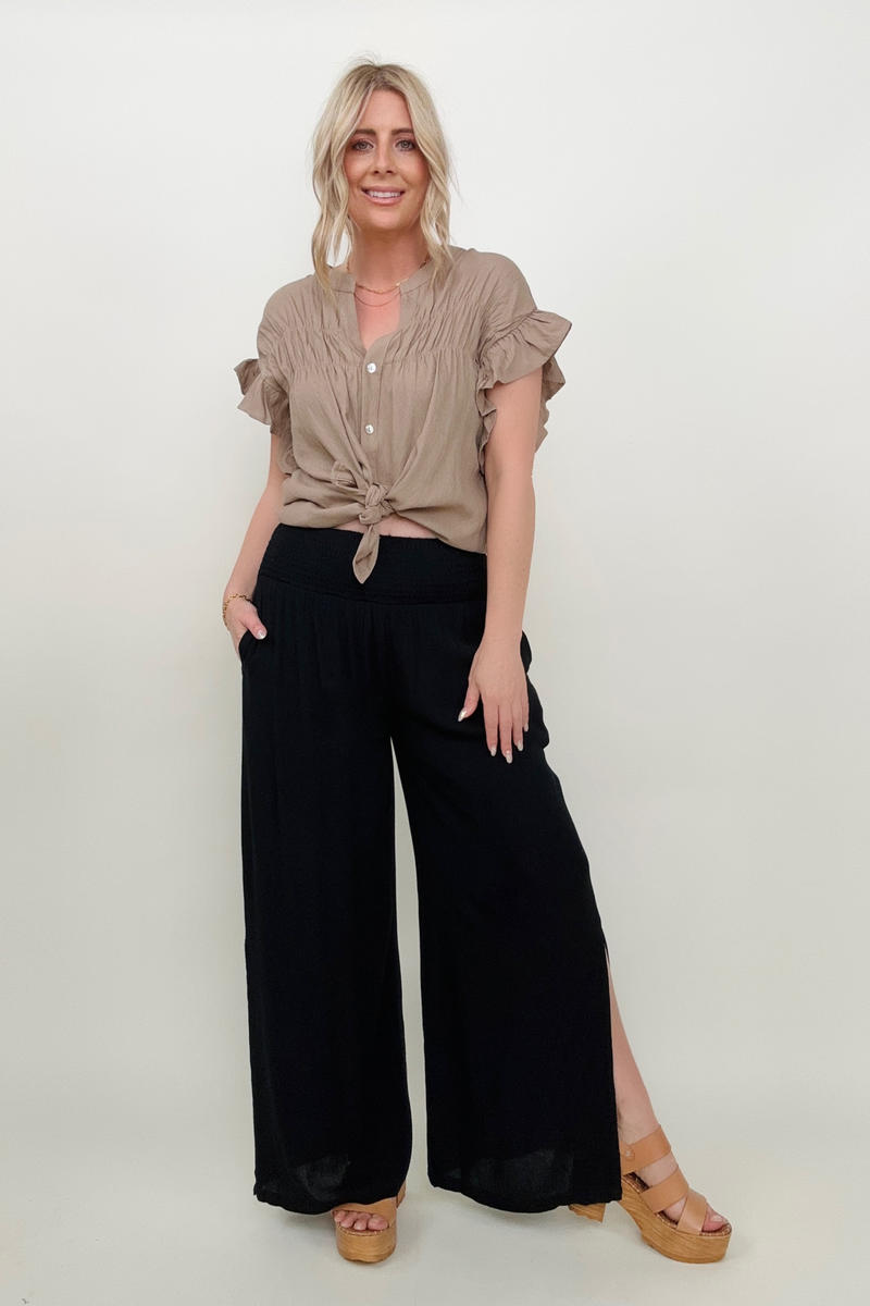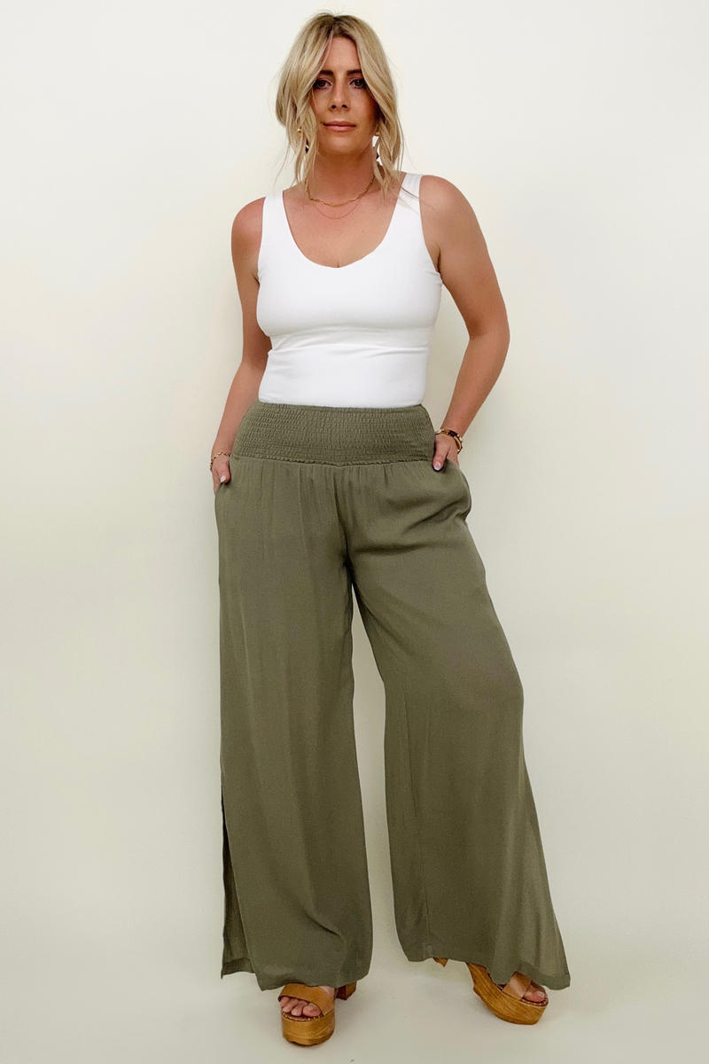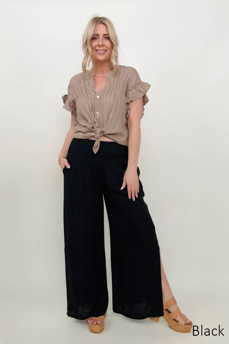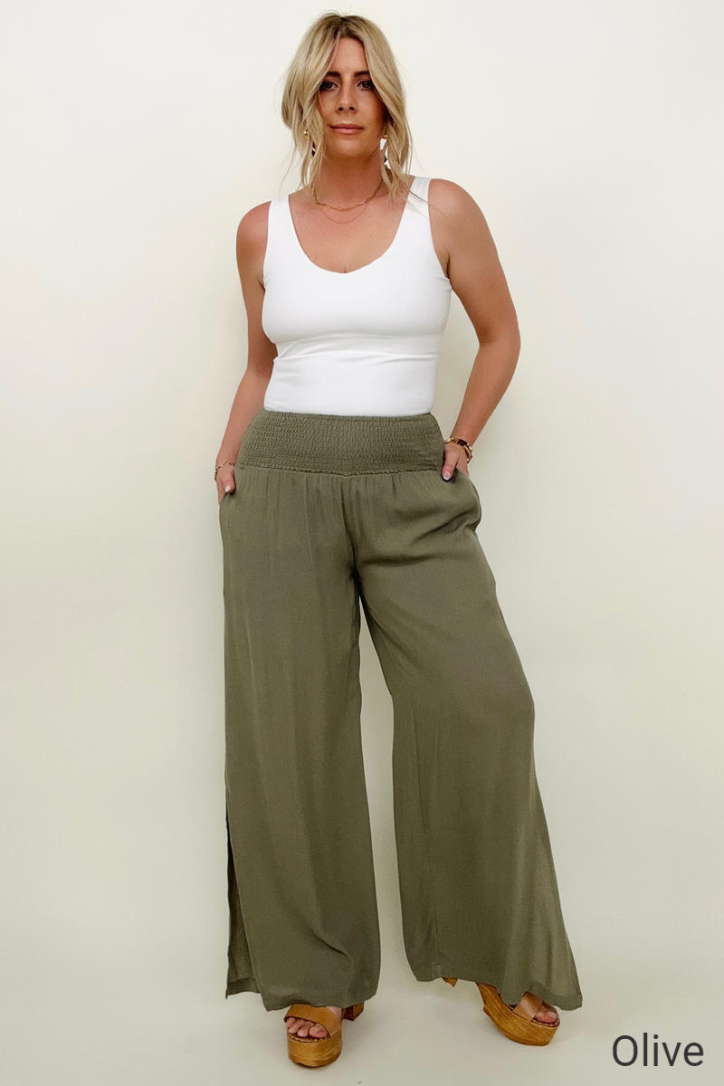 Cozy Co Crinkle Gauze Smocked Waist Wide Leg Side Slit Palazzo Pants