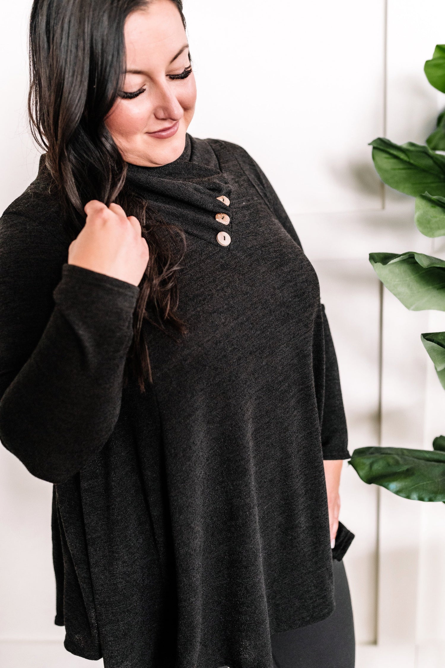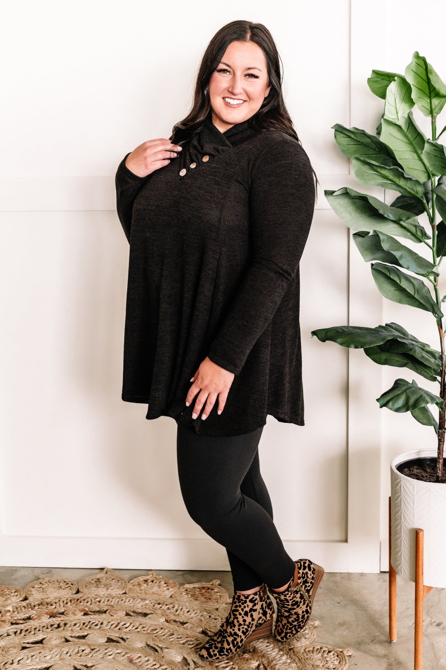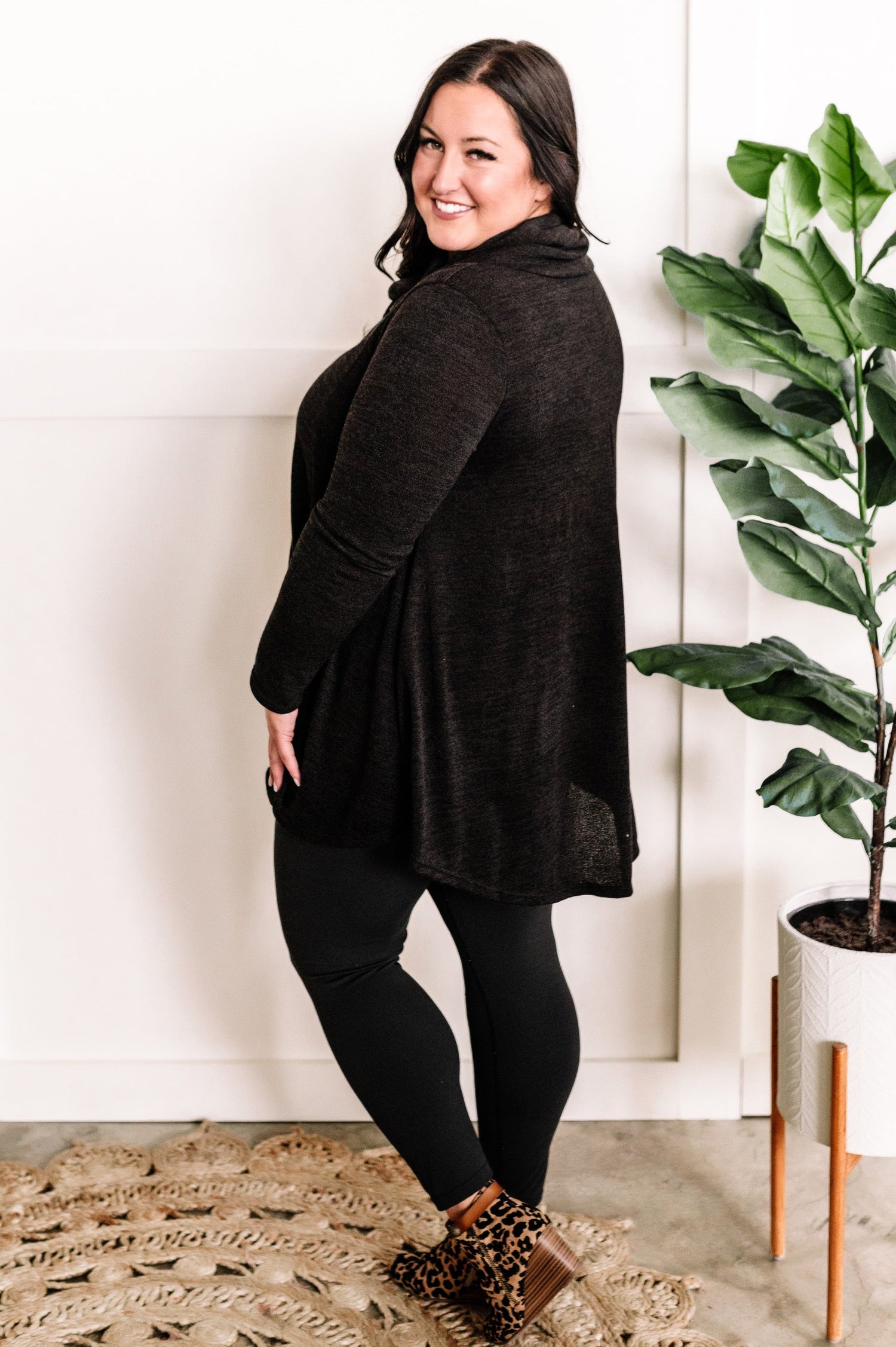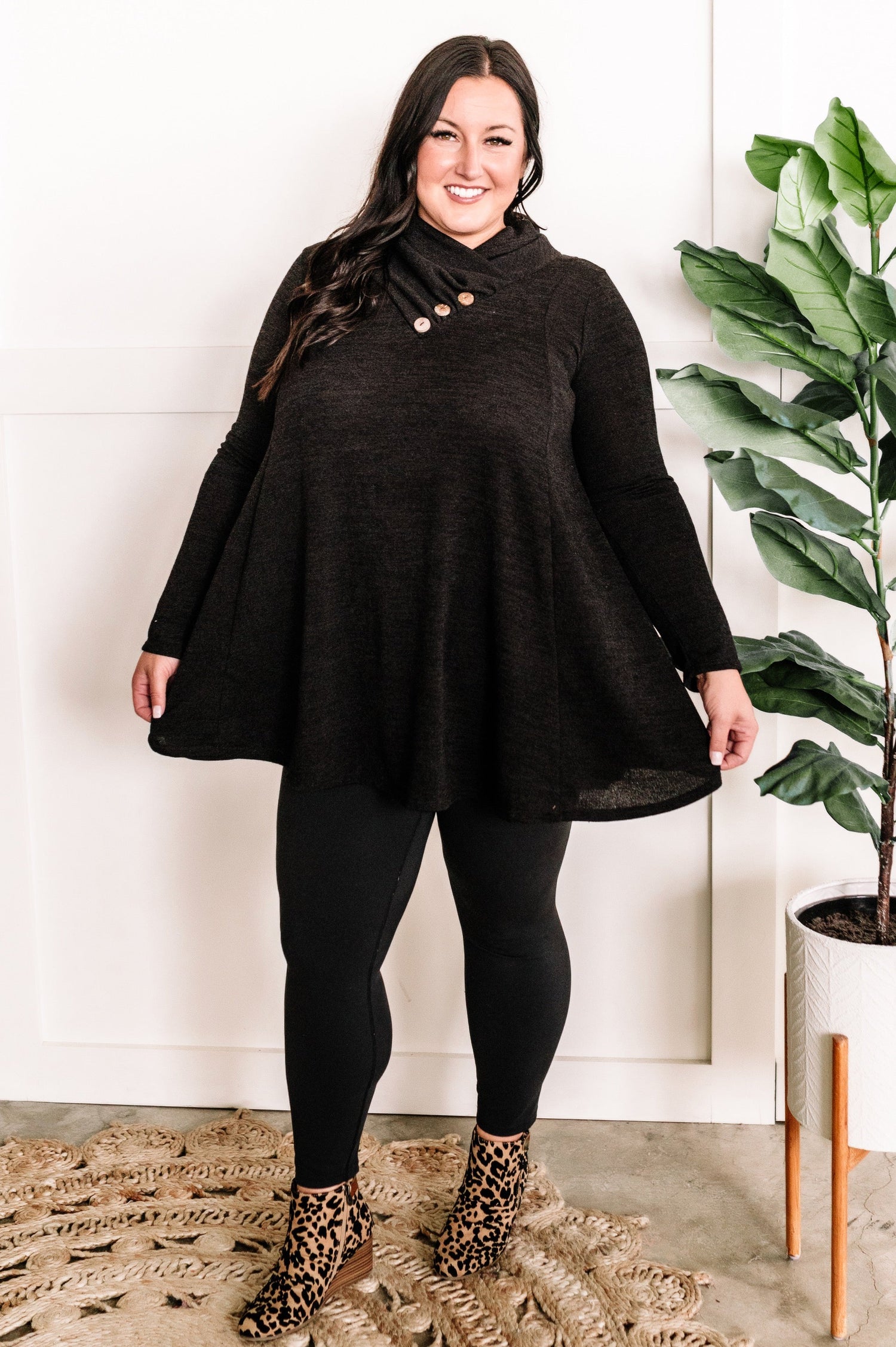 Crossover Cowl Neck Fit & Flare Tunic Sweater In Black