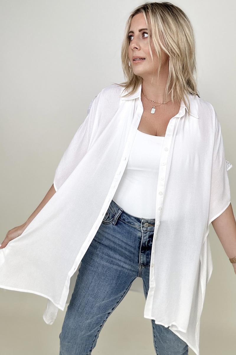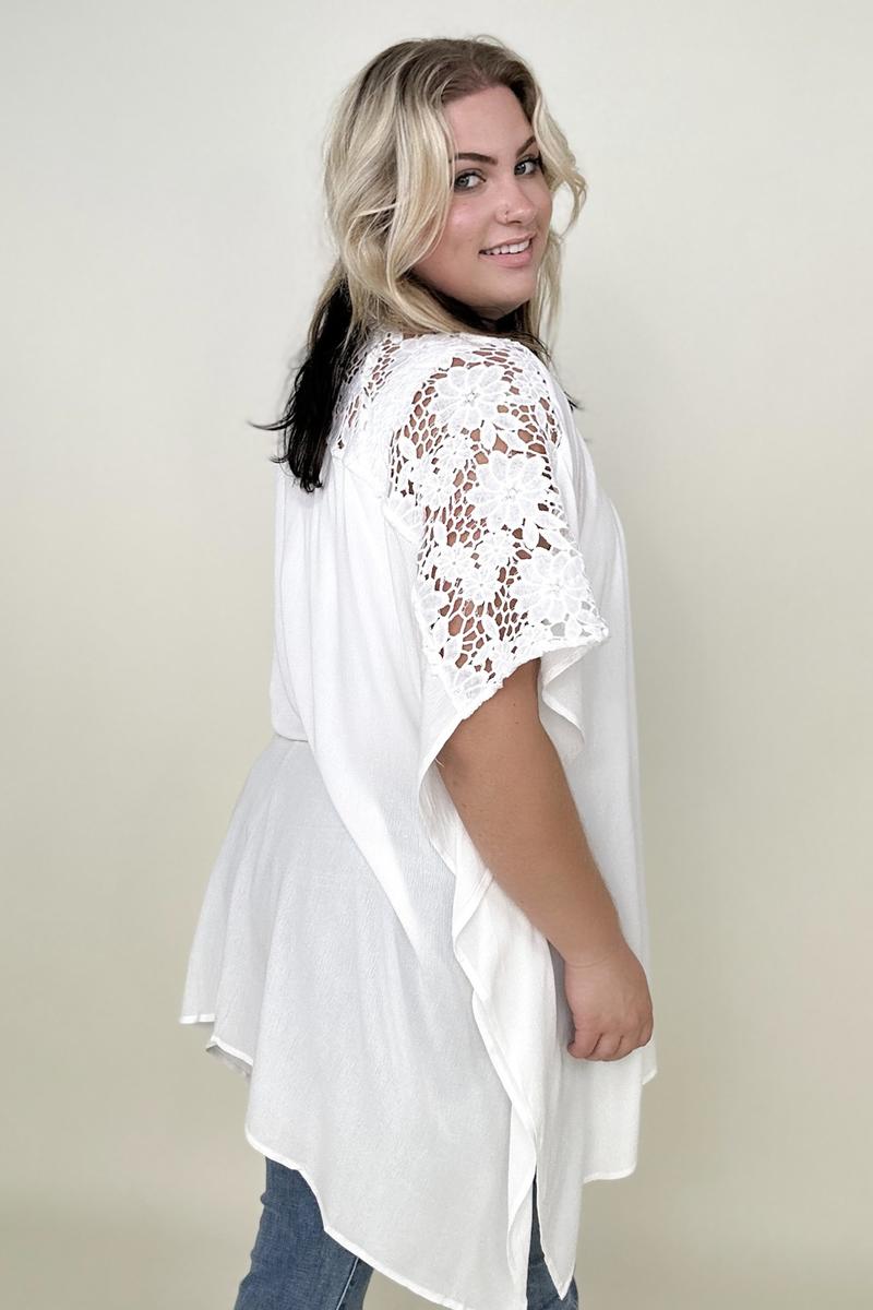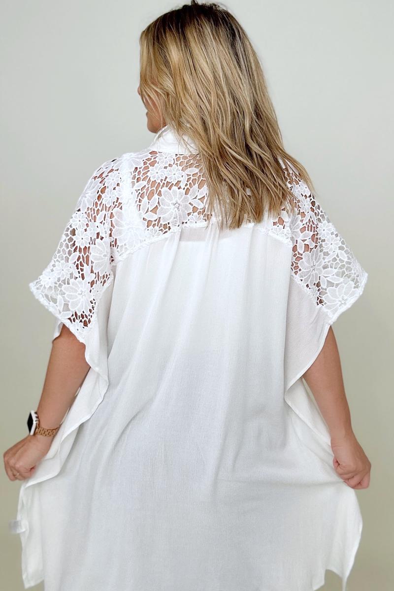 Davi & Dani Solid Button Down Short Sleeve Hi-Low Lace Loose Top