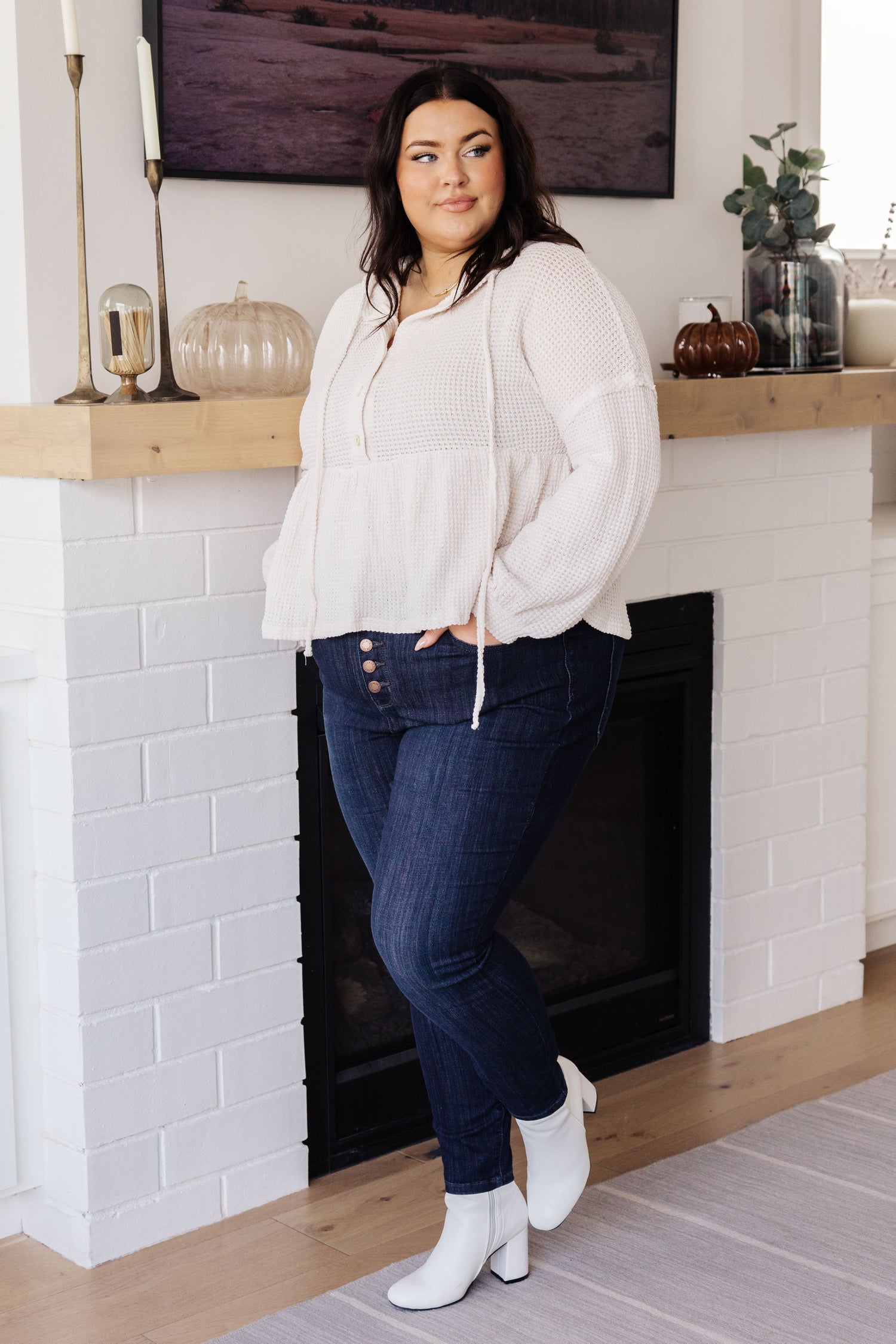 Stay cozy in style with the Don't Waffle About Waffle Knit Hoodie. This lightweight and ultra-soft top features a button up henley with a hood and a flattering peplum silhouette for a look that's both comfortable and fashionable.