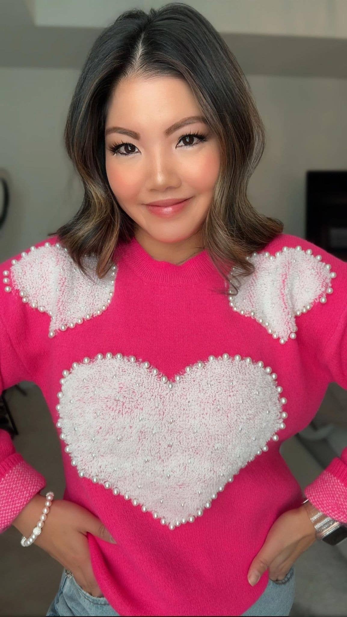 Dress to impress this season in the Sadie Neon Pearl Sherpa Heart Sweater! This cozy, feminine design features a neon pearl fabric blended with a soft sherpa heart for a unique and eye-catching look. Be the envy of your friends and make a statement with this one-of-a-kind sweater!