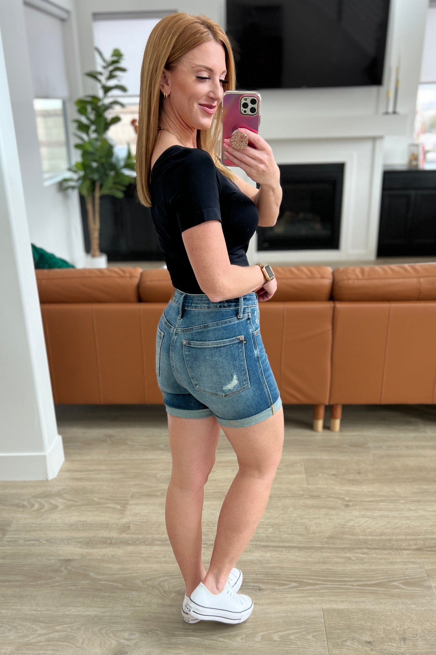 Flaunt your curves with Jessica High Rise Shorts from Judy Blue. The Tummy Control Tech keeps you looking and feeling your best. The optional cuffed hem adds a touch of vintage charm to these classic denim shorts. Perfect for any sunny adventure. Get them now before they're gone!