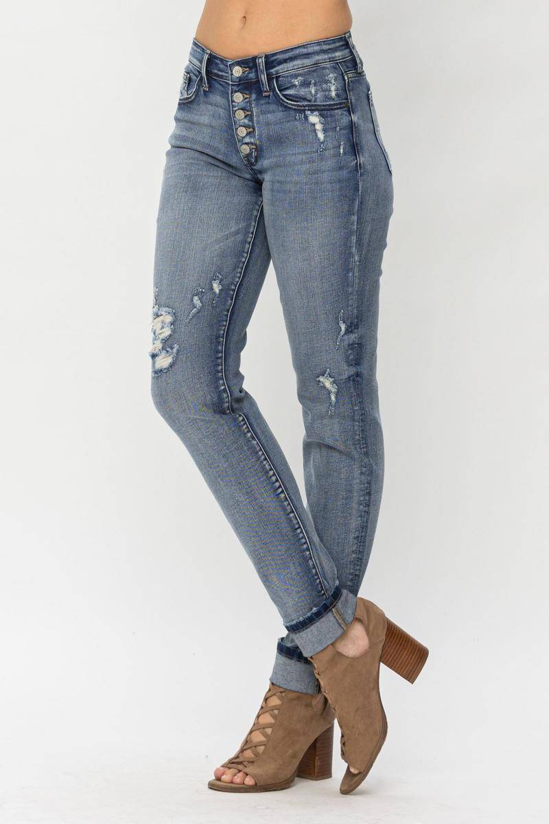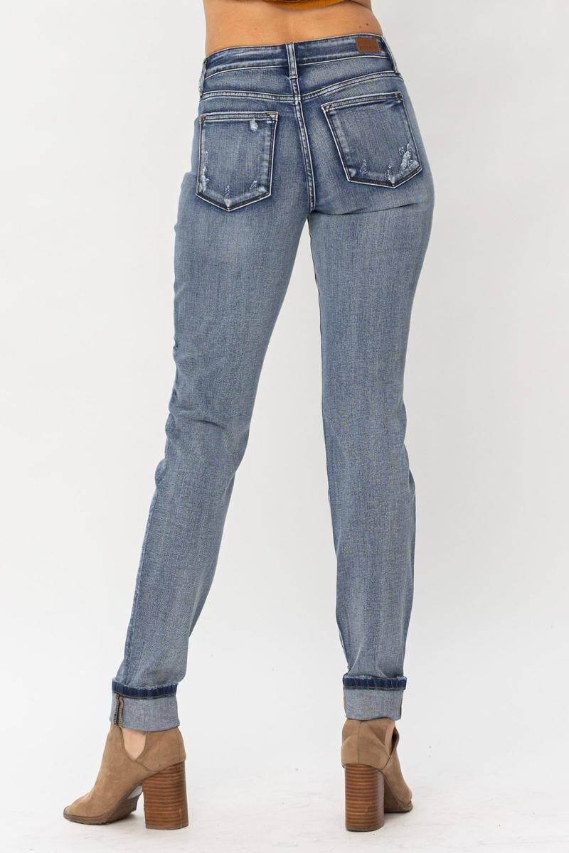 Judy Blue Mid-Rise Button Fly Contrast Wash Cuffed Boyfriend Jeans