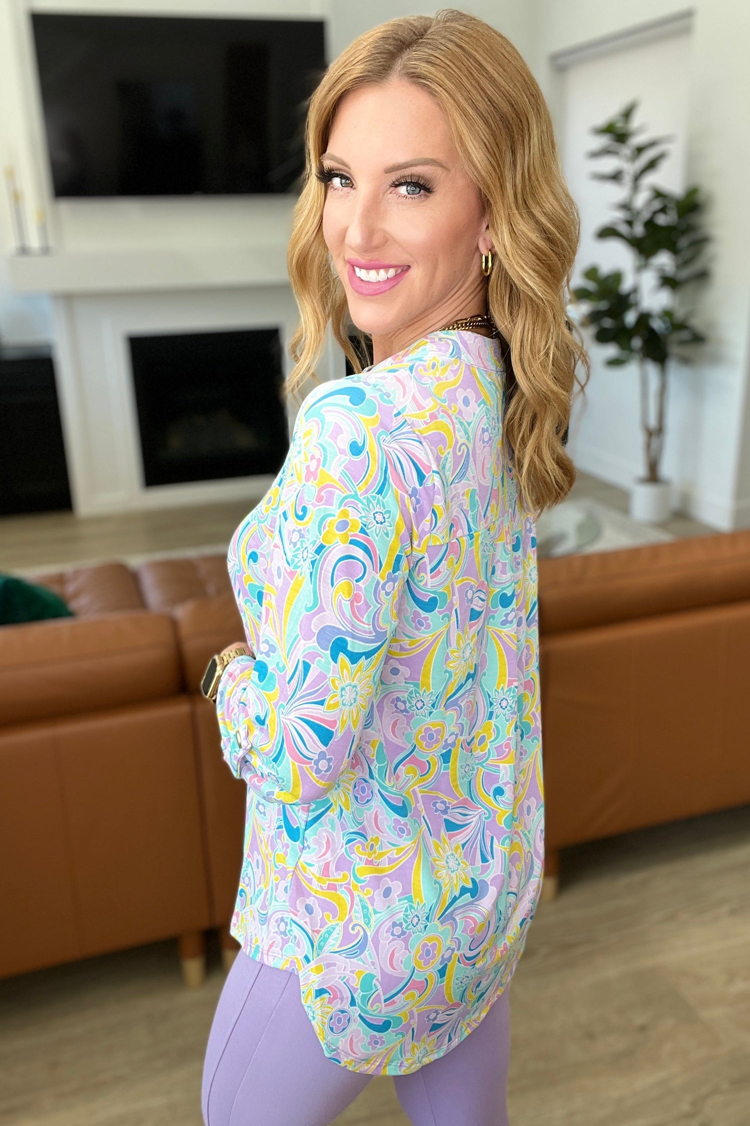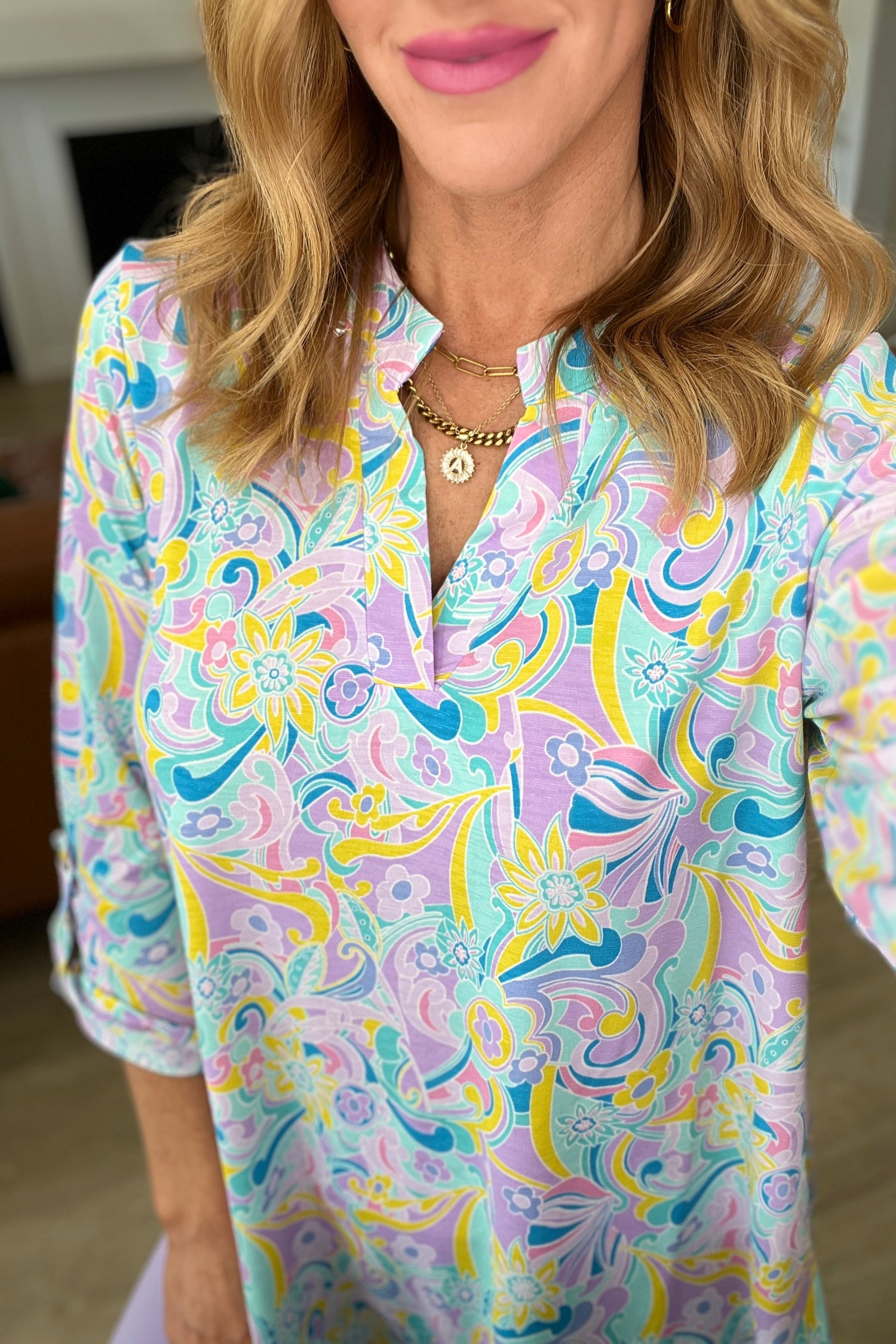Transform your closet with the Lizzy Top in Mod Lavender. Made from Bulgari, this top features a gabby neckline and button rolled sleeve tabs for a comfortable, yet eye-turning piece. The 3/4 sleeve and scoop hem add flow to the already stylish piece. Experience comfort and style in one with the Lizzy Top.