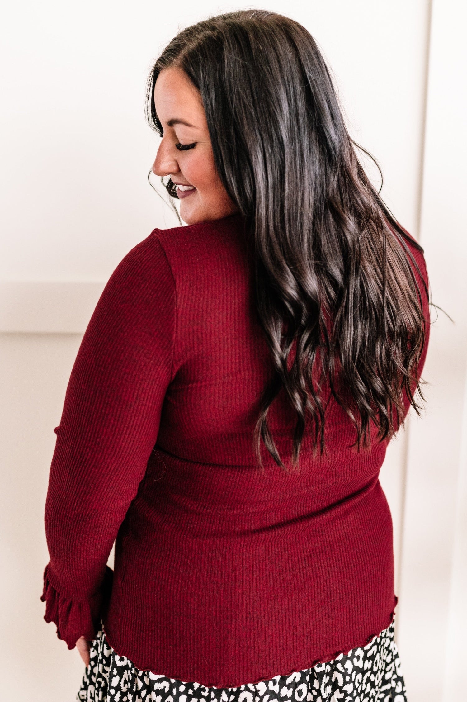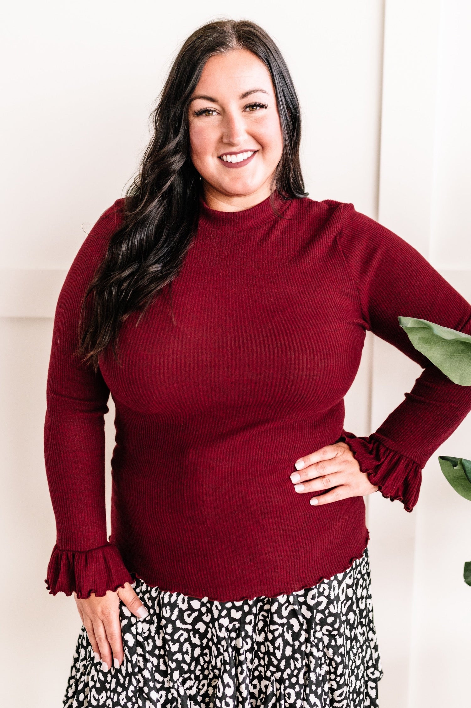 Mock Neck Bell Sleeve Knit Top In Heathered Burgundy