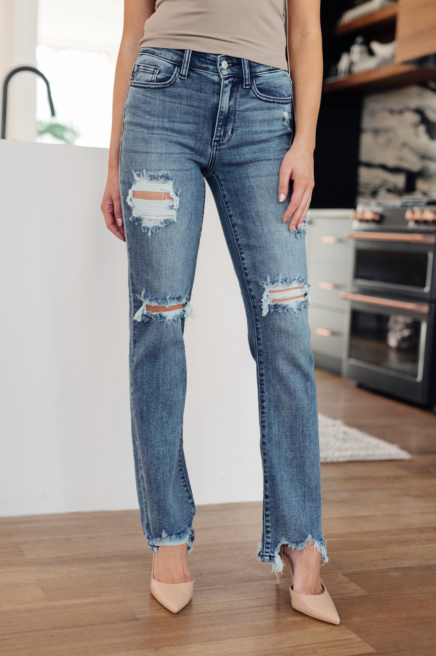 The O'Hara Destroyed Straight Jeans have the perfect balance of style, versatility, and timelessness! Featuring a stretch denim that shapes a mid rise waist with a five pocket cut and zipper fly. A slim fit through the thigh flares out at the ankle creating a straight cut silhouette. To top it off- these jeans have the perfect amount of distressing for an effortless cool girl look!