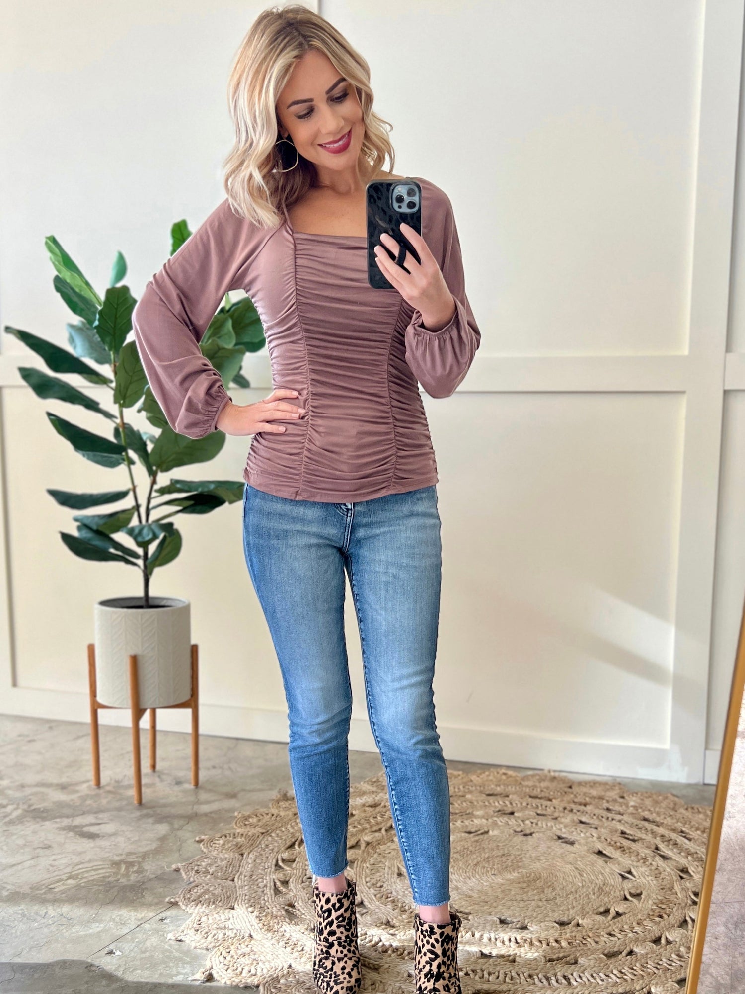 Kelly (wavy highlighted hair) Chest: 34" Waist: 29" Height: 5'6" Wearing a Small