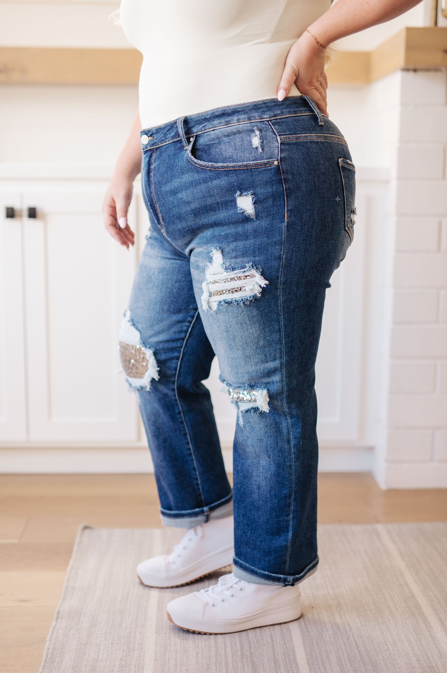 Make an unforgettable statement with the Suki Mid Rise Sequin Patch Tapered Jeans! Featuring heavy distressing, sequin patches, and a tapered cut, these jeans will elevate any look with their mid rise silhouette and ankle length. Shine all night, wherever you go!