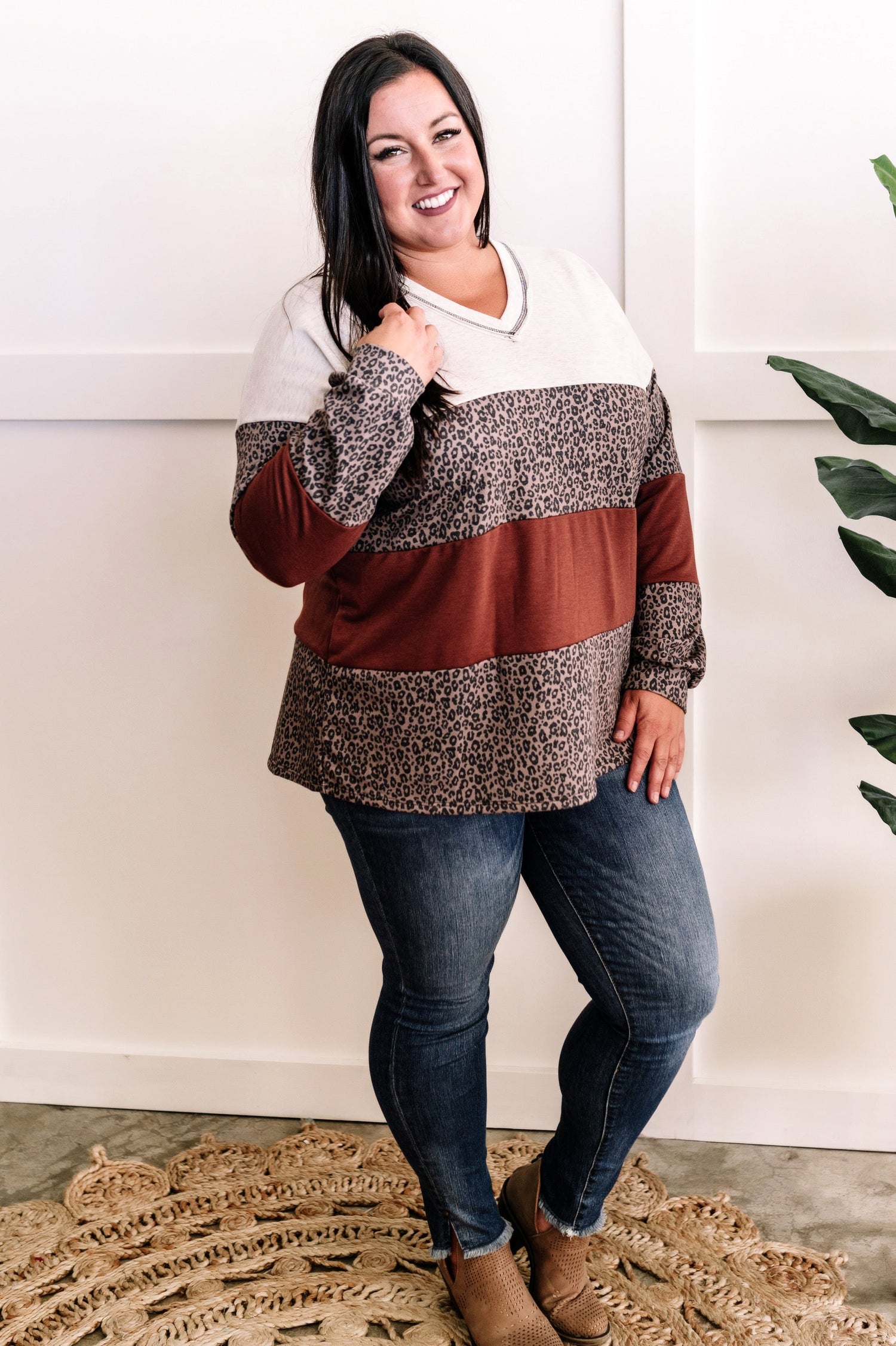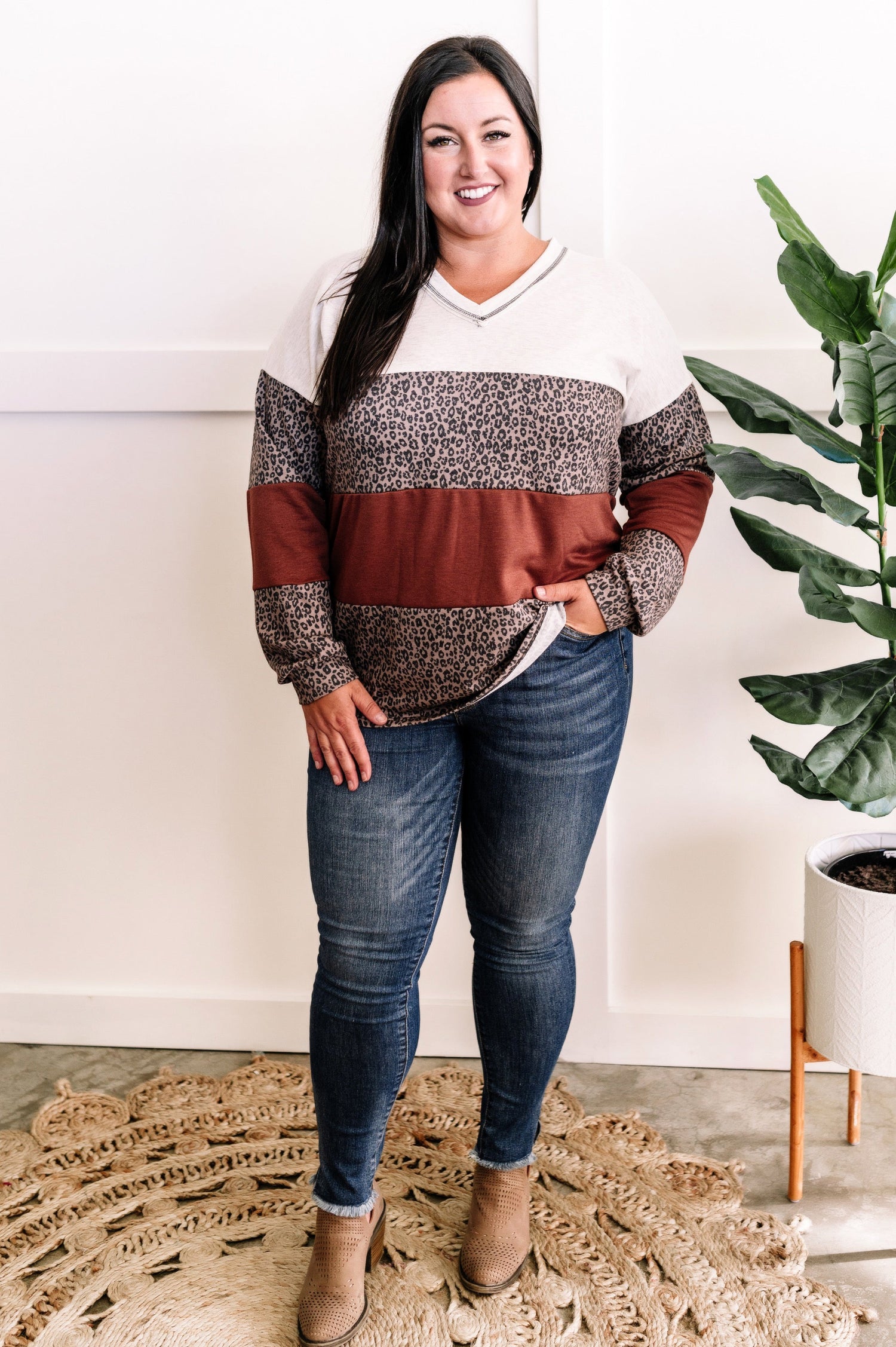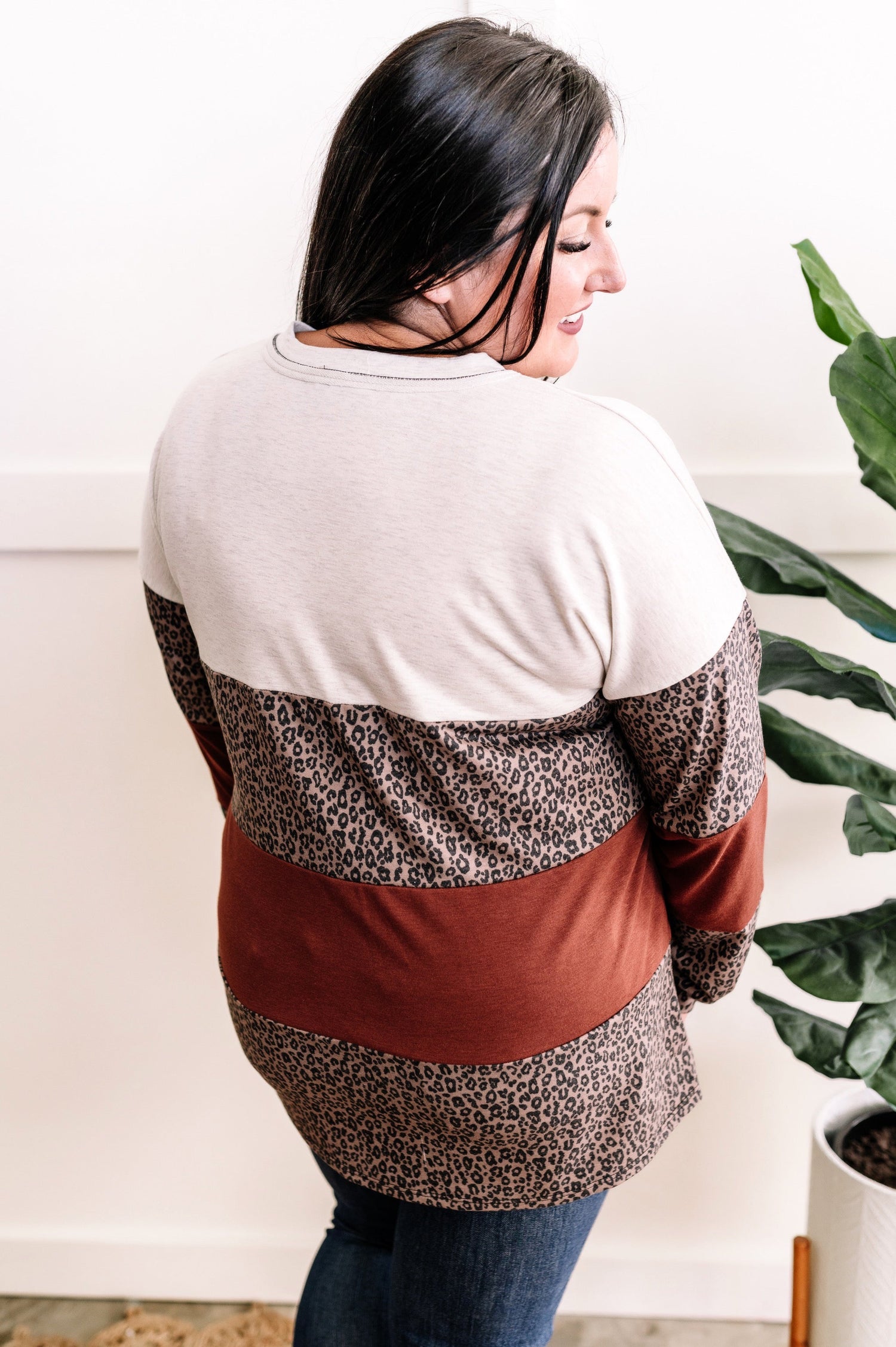 V Neck Long Sleeve Color Block Top In Rust & Neutral Leopard